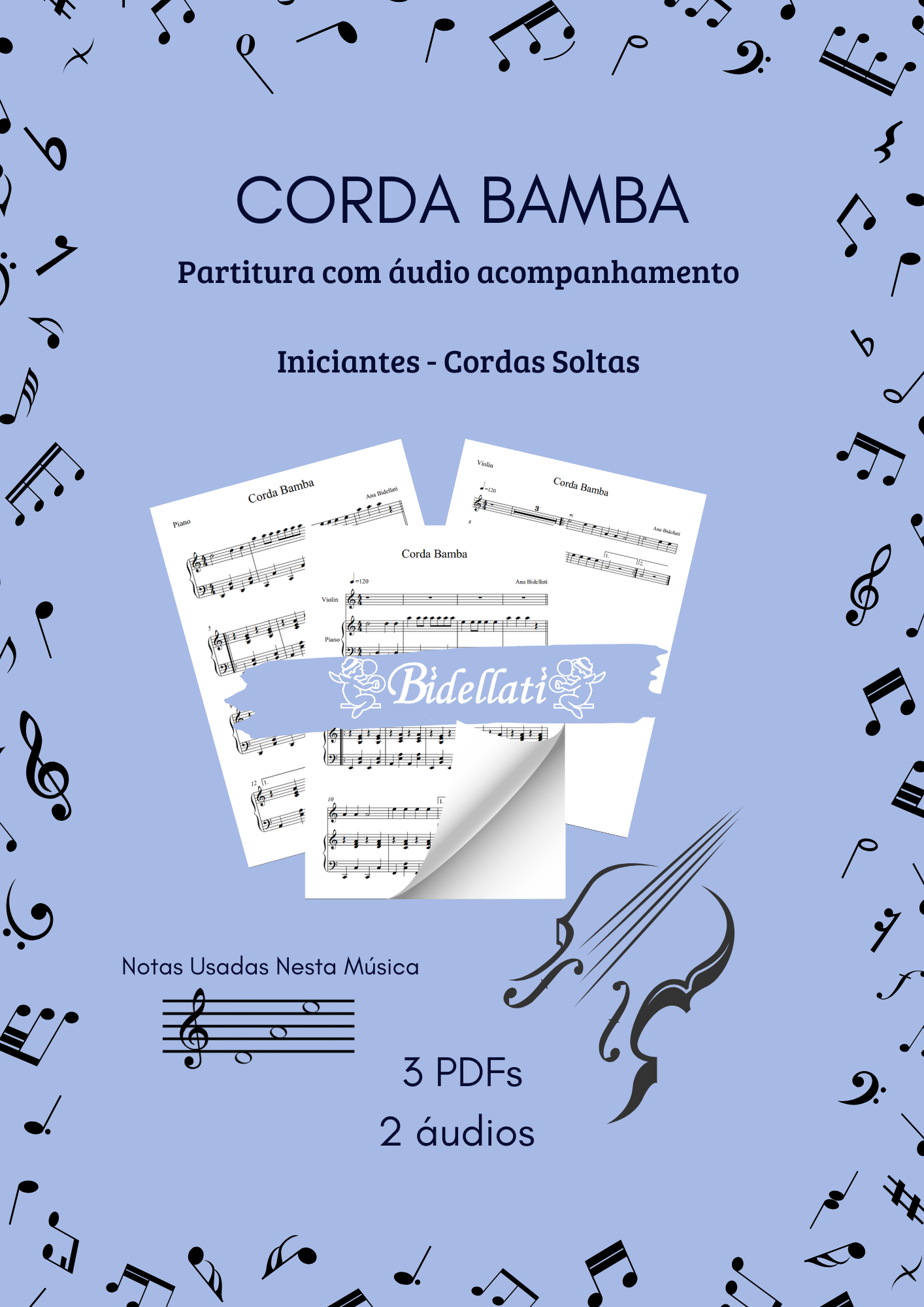 A partitura de violino é pensada para iniciantes, utilizando cordas soltas, permitindo que o aluno entre em contato com o ritmo e a expressividade desde o começo da sua jornada musical.